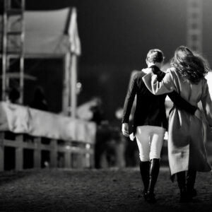 6. After the corner, ride straight on the short side (again without flexing to the inside). Both your seat bones should be equally weighted, while both your legs hang down at the girth, driving the horse straight forward. Both reins should be of equal length as you ask for a transition back to trot with a half-halt to prepare, followed by quick pressure with both calves and “giving” with both reins equally.