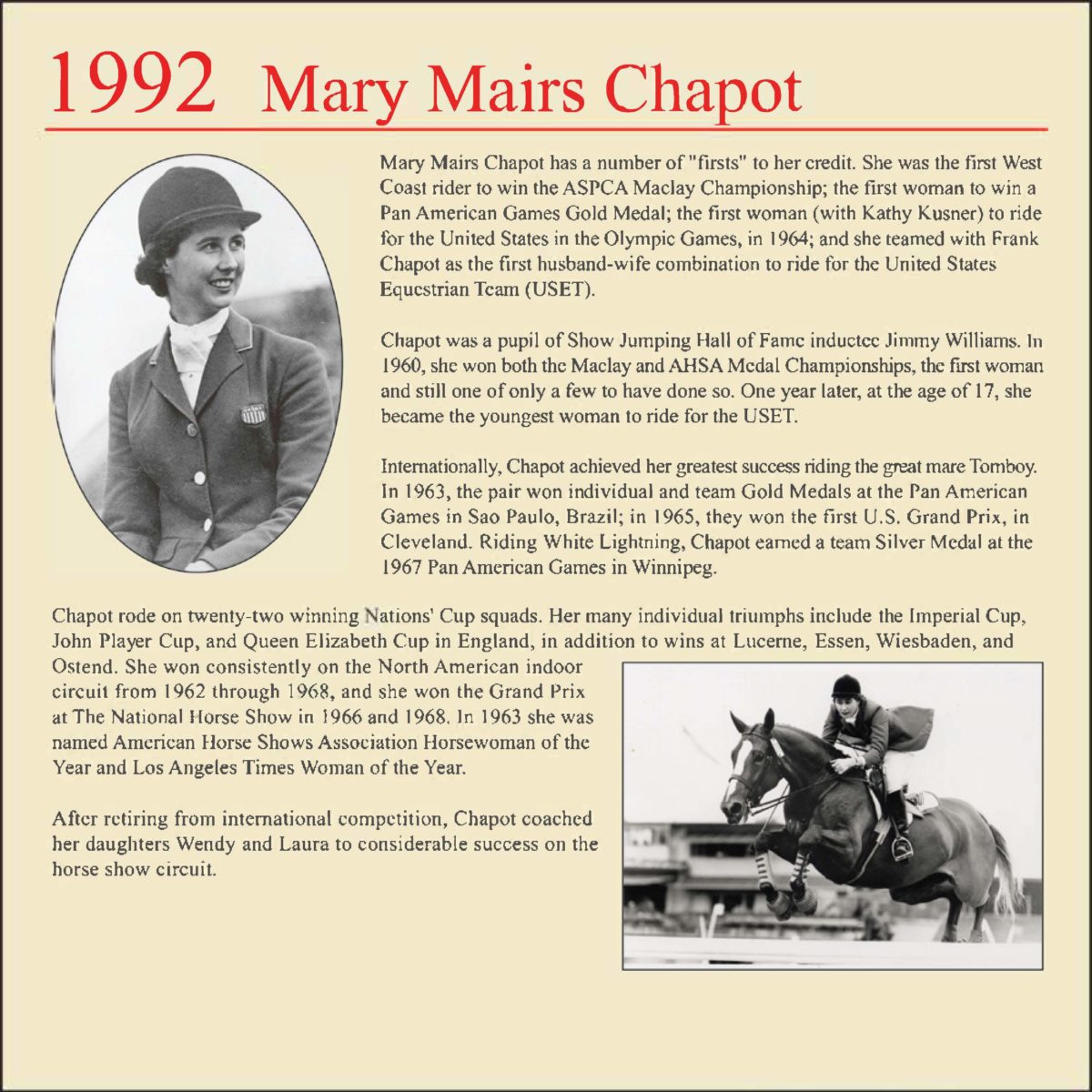 Each week on #HallOfFameThursday, Horse Network recognizes members of the Show Jumping Hall of Fame with an inductee’s plaque, historical photos and, on the first Thursday of every month, an historic article about a Show Jumping Hall of Famer. This week’s featured inductee, in celebration of Women’s History Month, is Mary Mairs Chapot, Class of 1992.