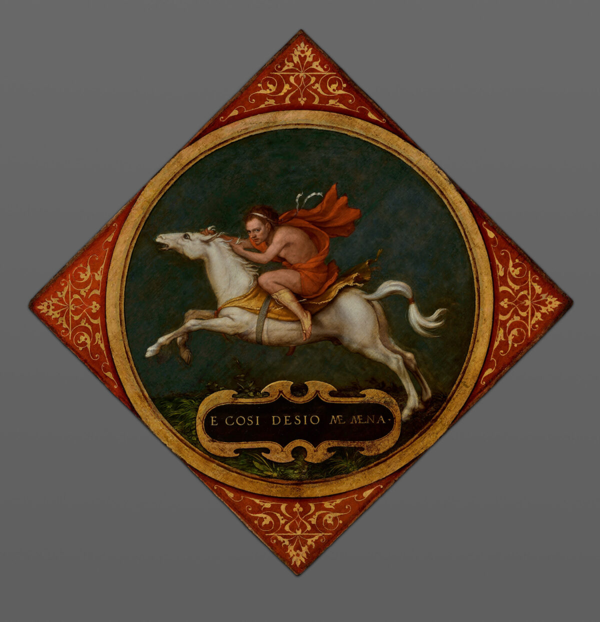 The horse’s stride arches over a gold-framed cartouche. It reads: E cosi desio me mena. Translated from the Italian, “And so desire carries me along.”