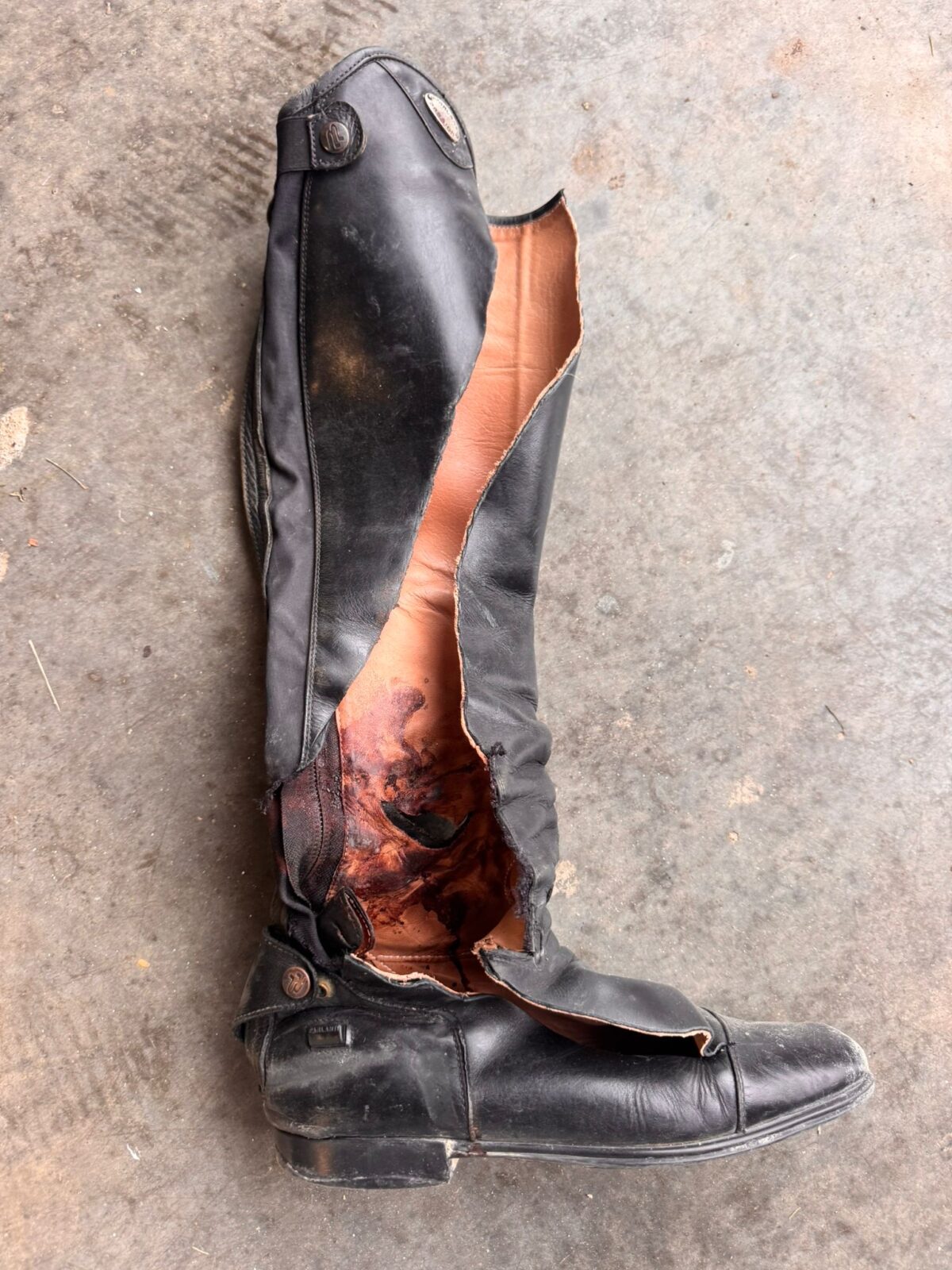 I still wasn’t feeling pain when we got to the ER, and I was angry and confused in the hospital, when the medical staff began to cut off my clothing. I saw this huge pair of scissors, and I realized they were cutting off a brand-new pair of breeches, and my Parlanti boots.